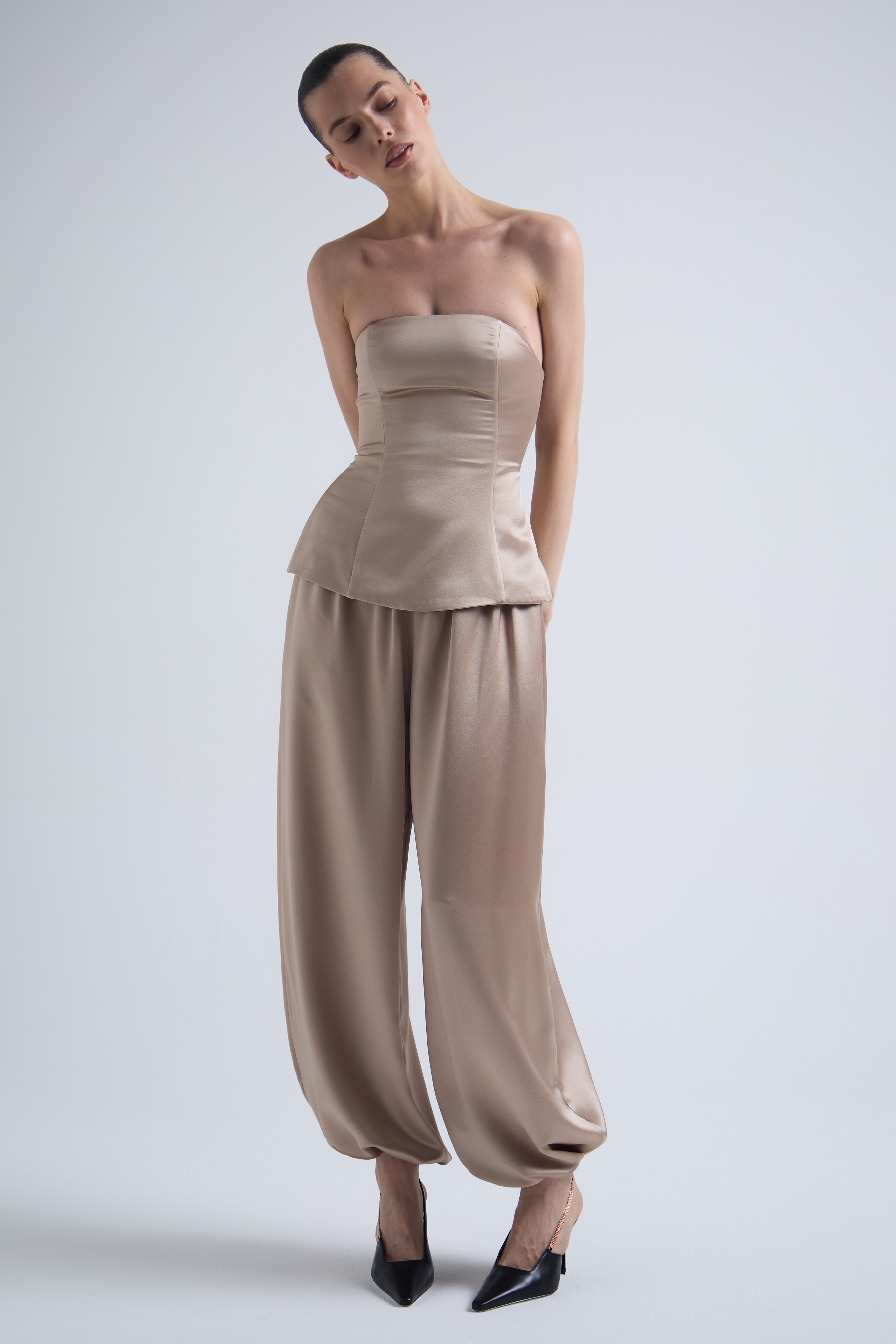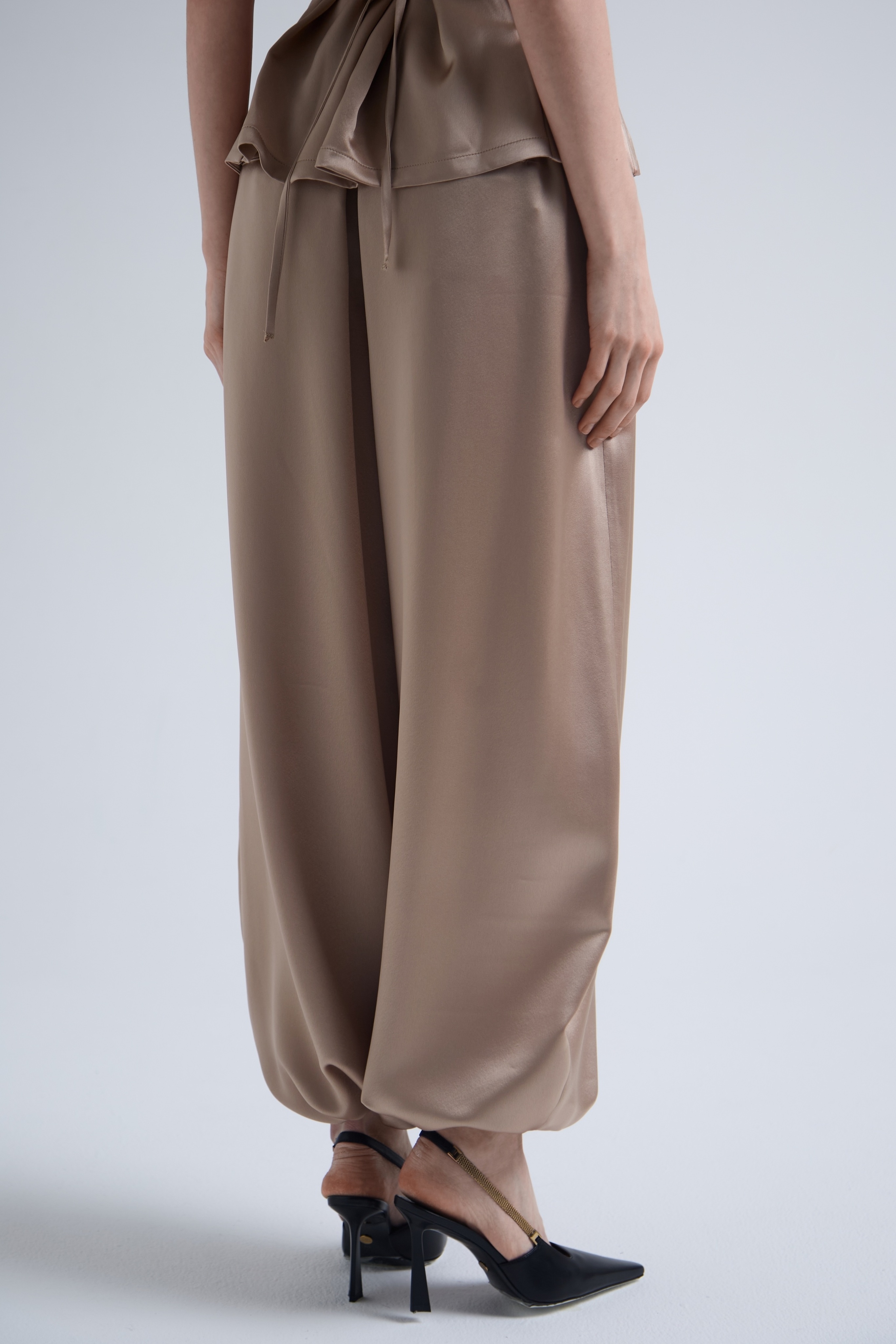 Брюки из плотного ацетатного атласа с выразительным переливом. Тяжёлый, текучий материал формирует мягкий, но структурный силуэт, создавая ощущение глубины и движения в образе.