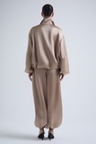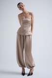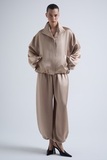Лаконичный крой дополнен функциональными деталями: эластичный пояс обеспечивает комфортную посадку, а скрытые кулиски по низу брюк позволяют менять силуэт — от расслабленного прямого до объемного, с фиксацией на лодыжках.