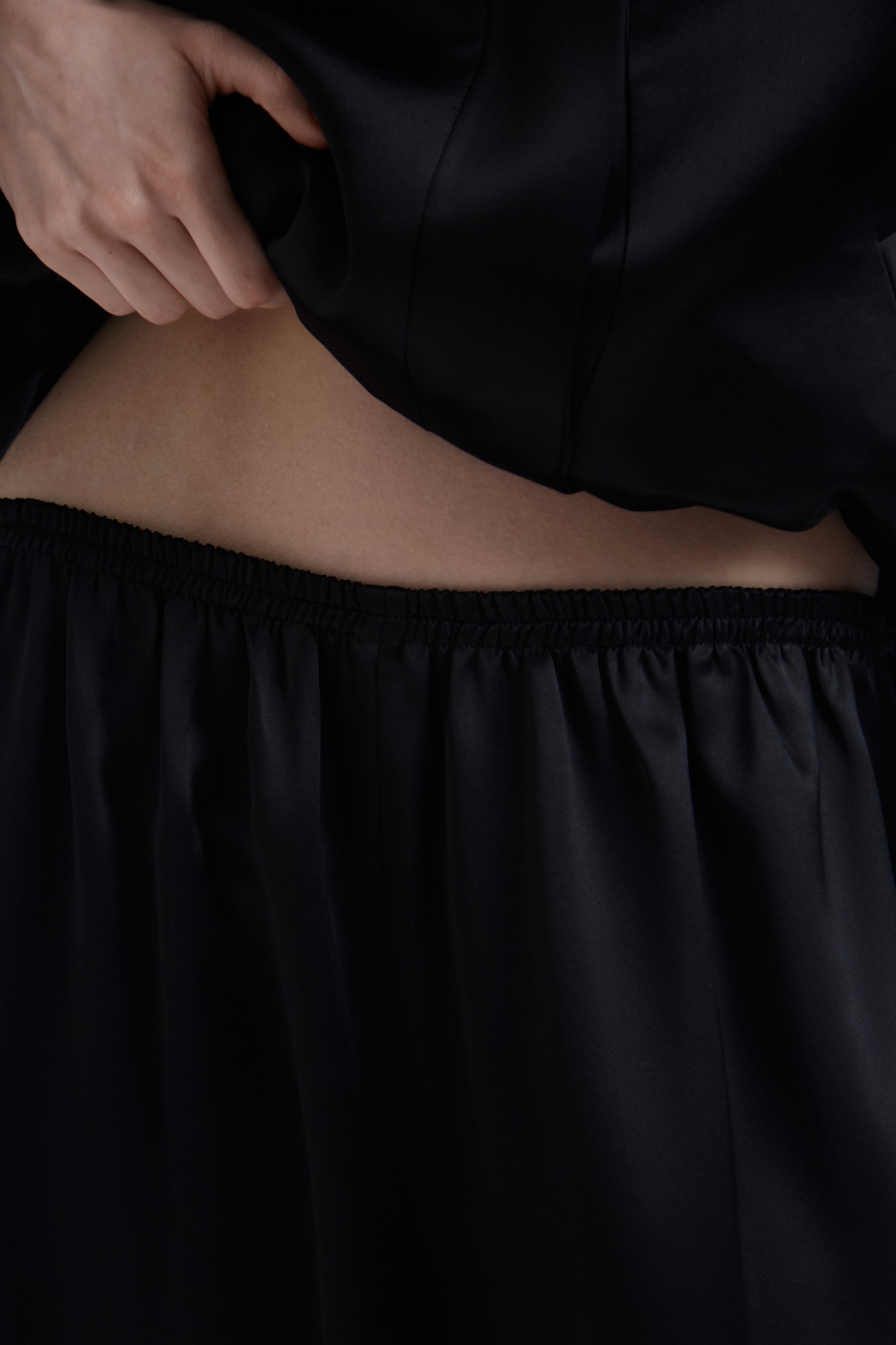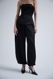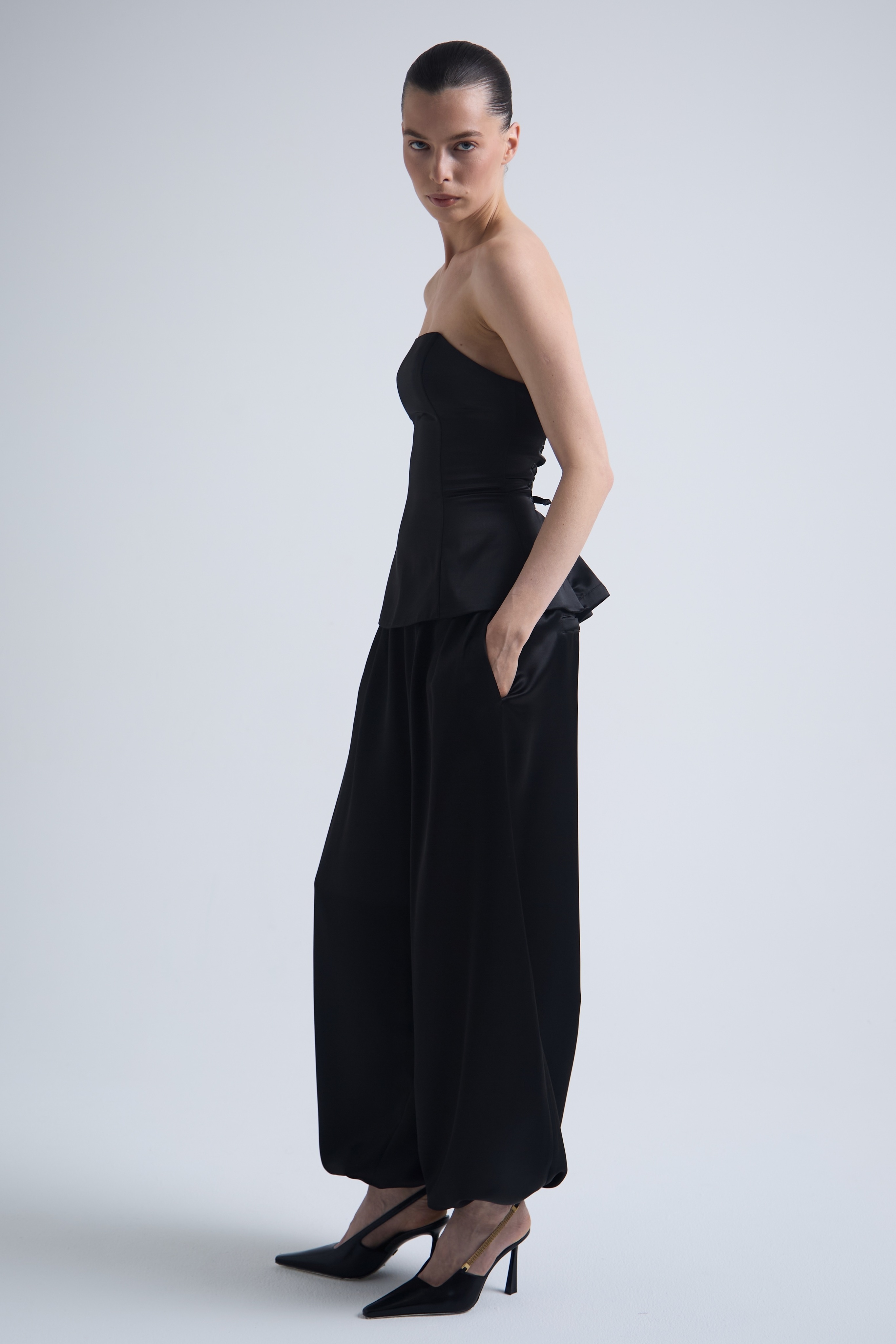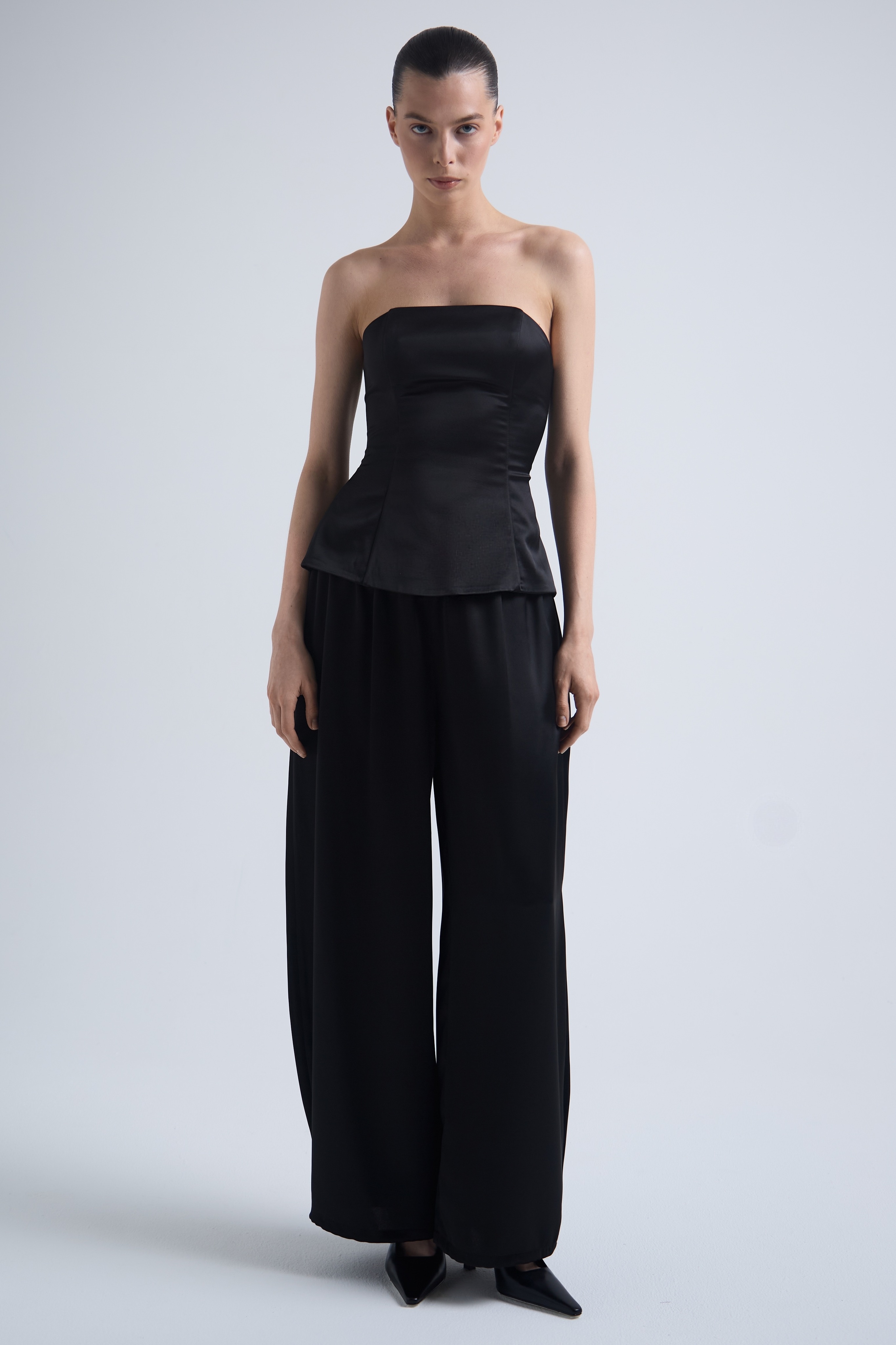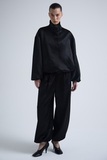 Брюки из плотного ацетатного атласа с выразительным переливом. Тяжёлый, текучий материал формирует мягкий, но структурный силуэт, создавая ощущение глубины и движения в образе.