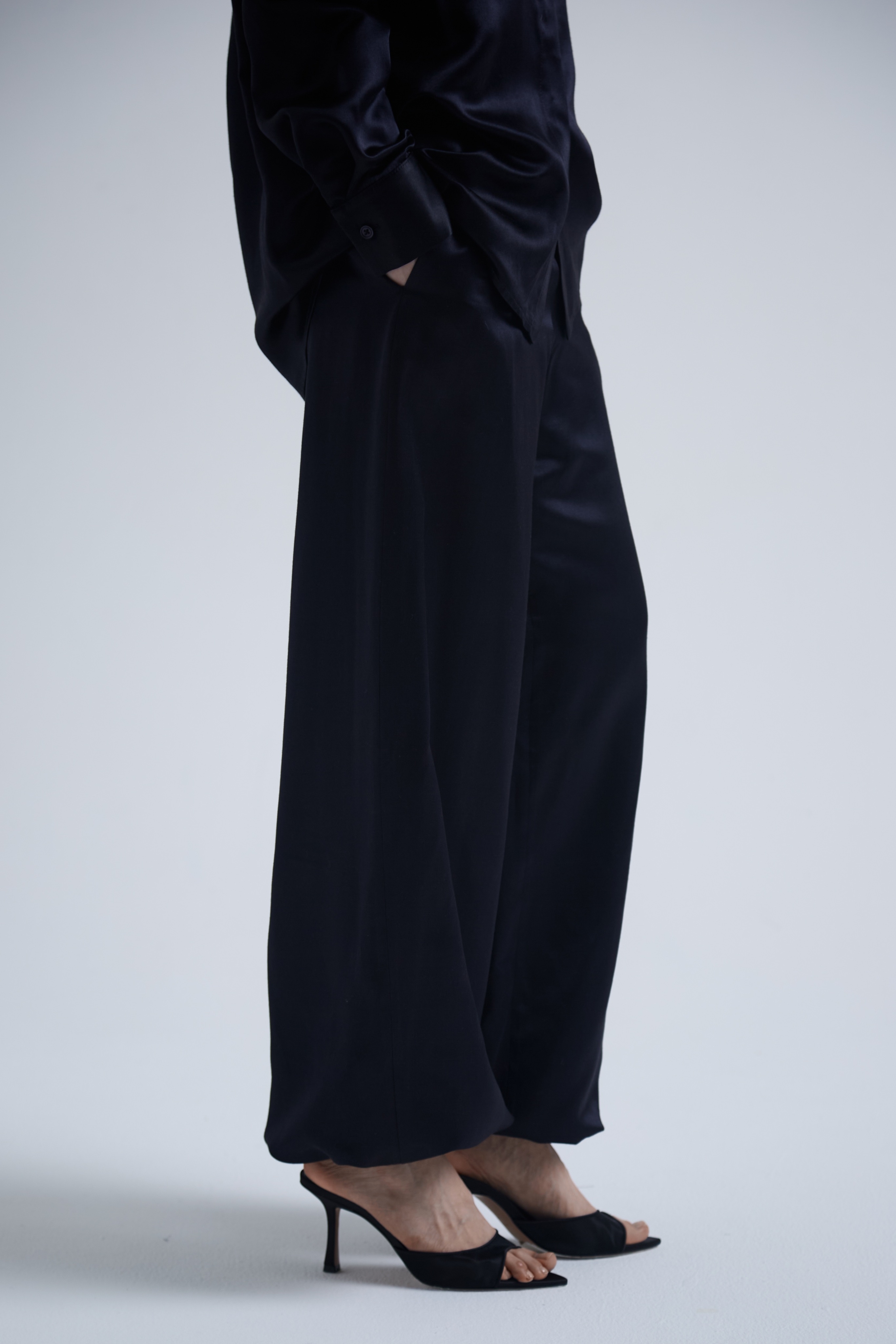 Брюки Deep из плотного шелка с кашемиром в насыщенном темно-синем оттенке. Ткань мягко ложится по телу, сохраняя форму и создавая глубокий, равномерный цвет с деликатным сатиновым отблеском.