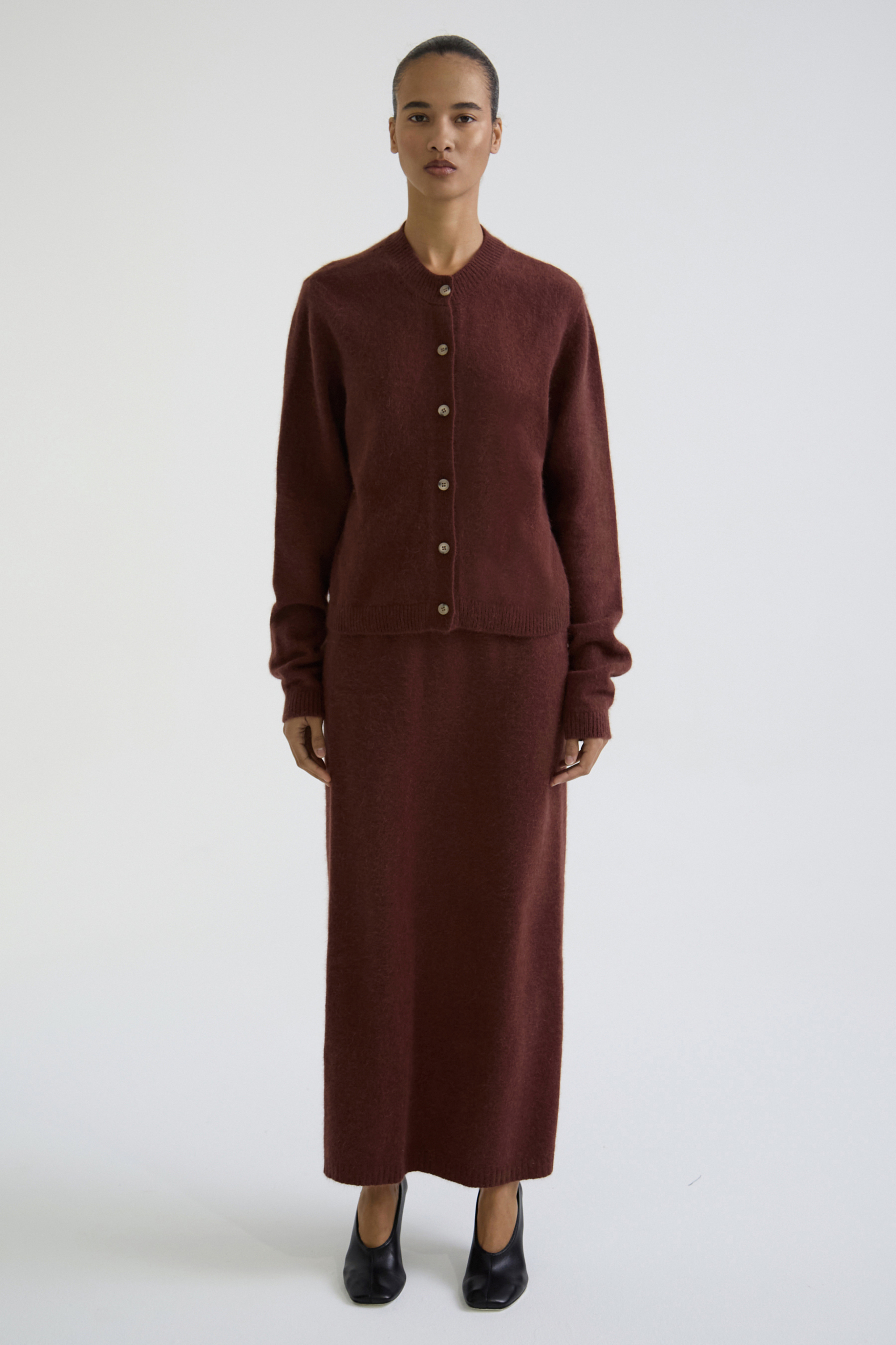 Юбка образует гармоничный комплект с кардиганом или свитером из той же пряжи.