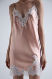 Кружево мягко обрамляет зону декольте и низ изделия. Эта деликатная отделка выполнена вручную: кружево вырезано и собрано так, чтобы подчеркнуть живую структуру шелка.