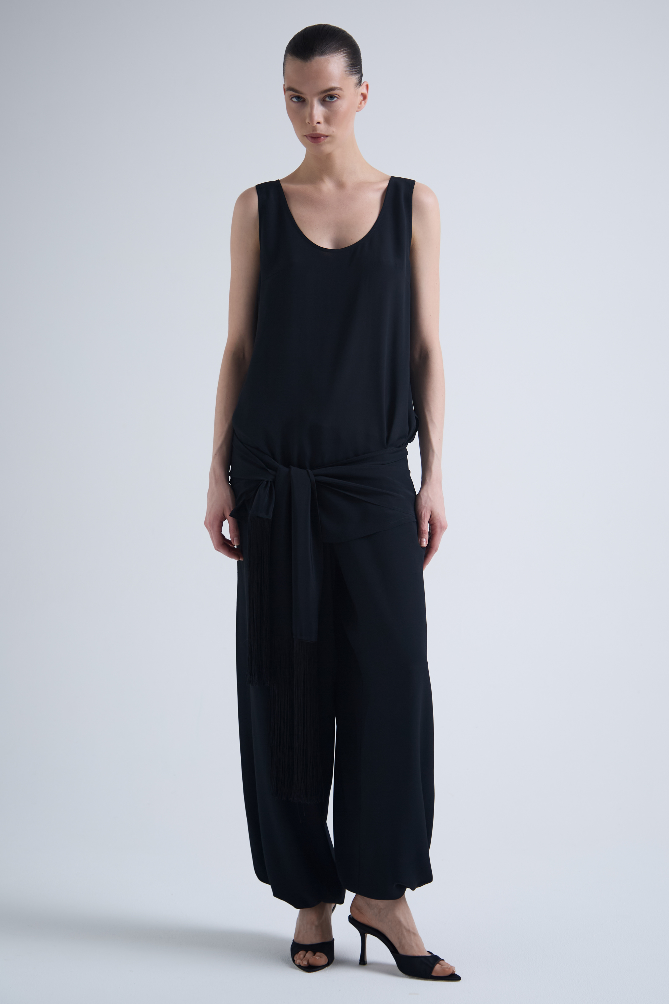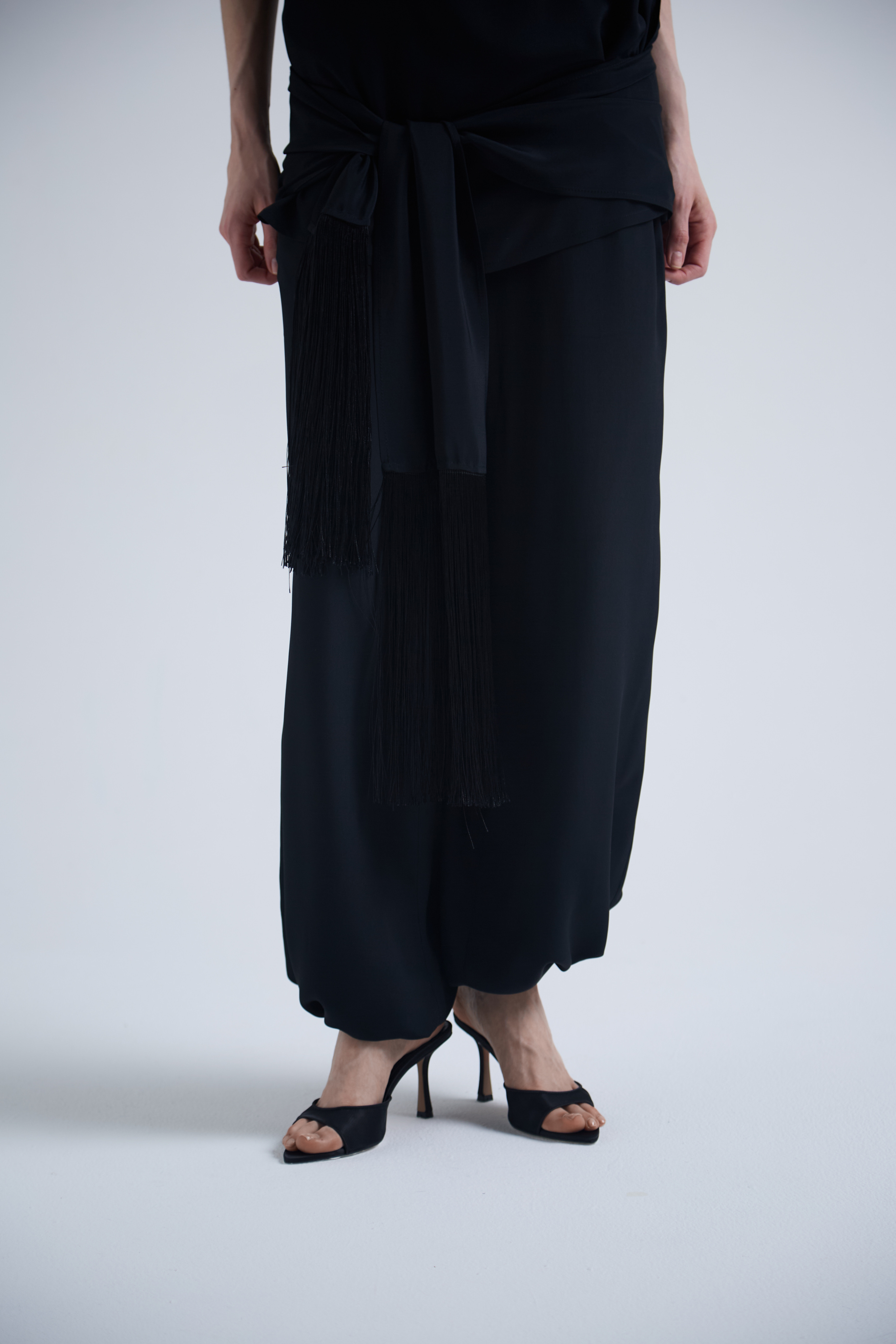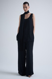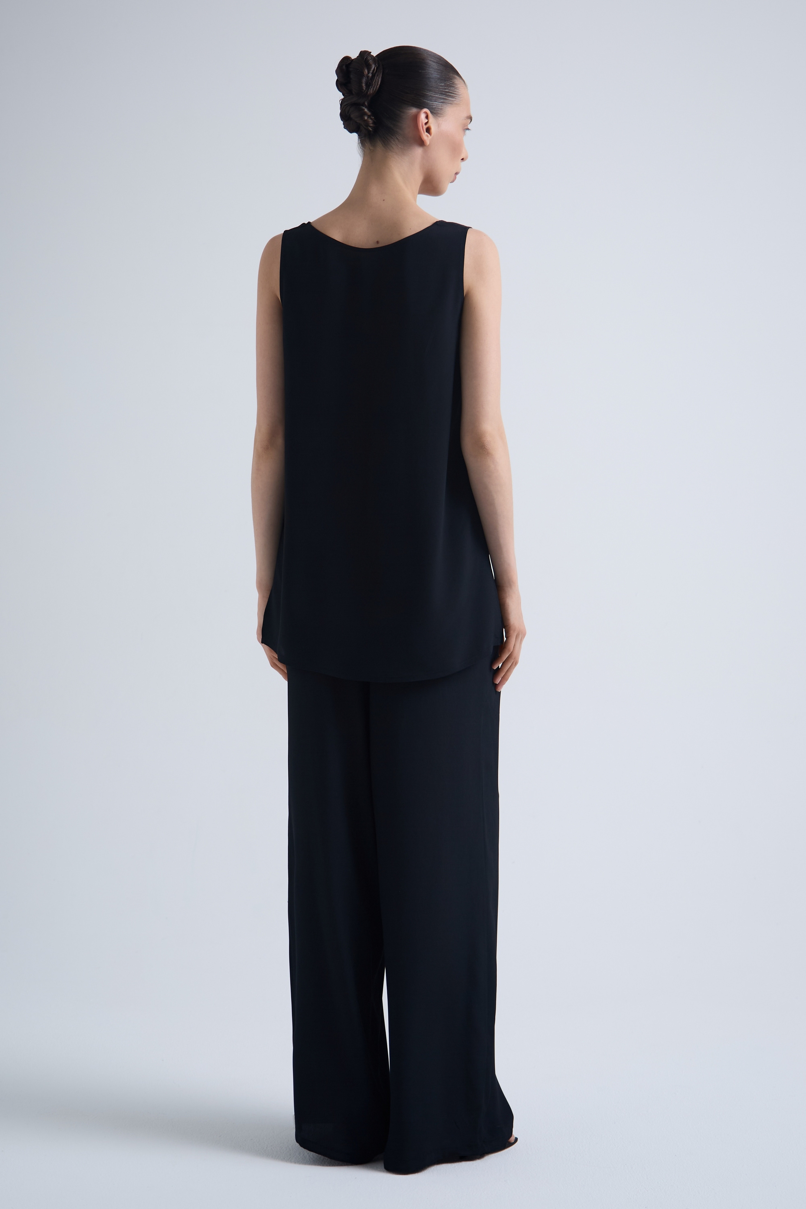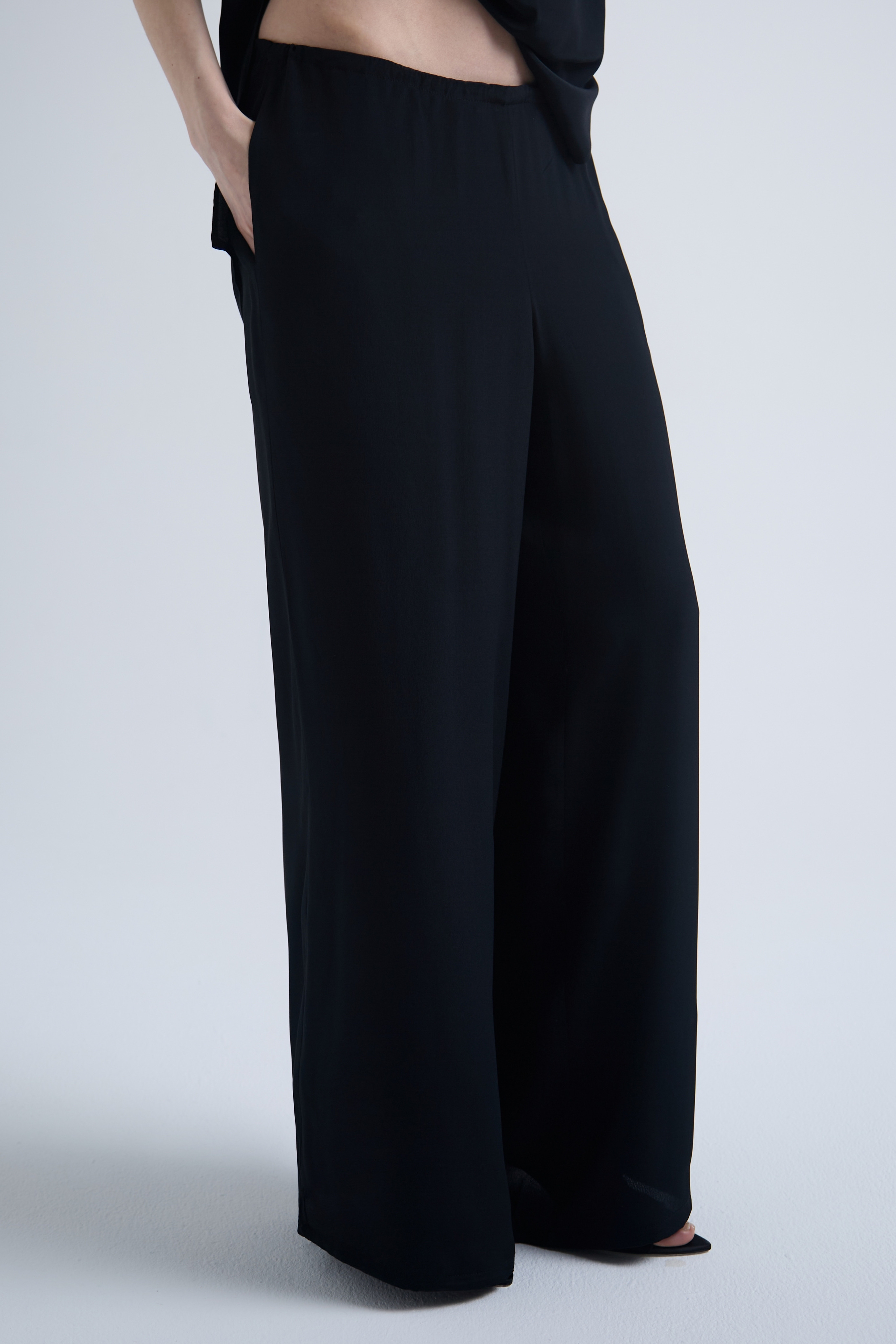 Свободные брюки прямого силуэта из тончайшего шёлка и ацетата в чёрном цвете. Материал мягко струится вдоль тела, формируя лёгкий, вертикально вытянутый силуэт.