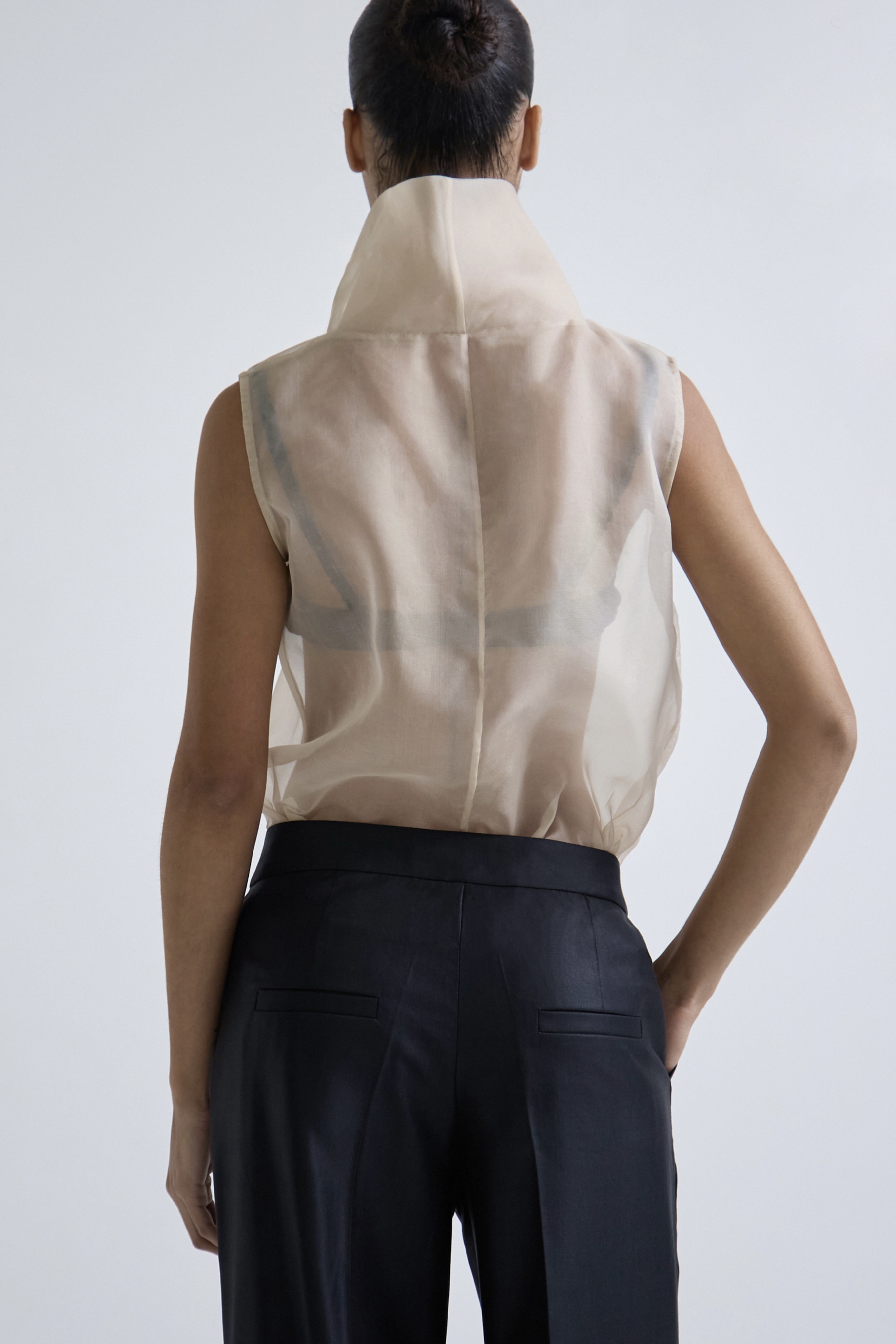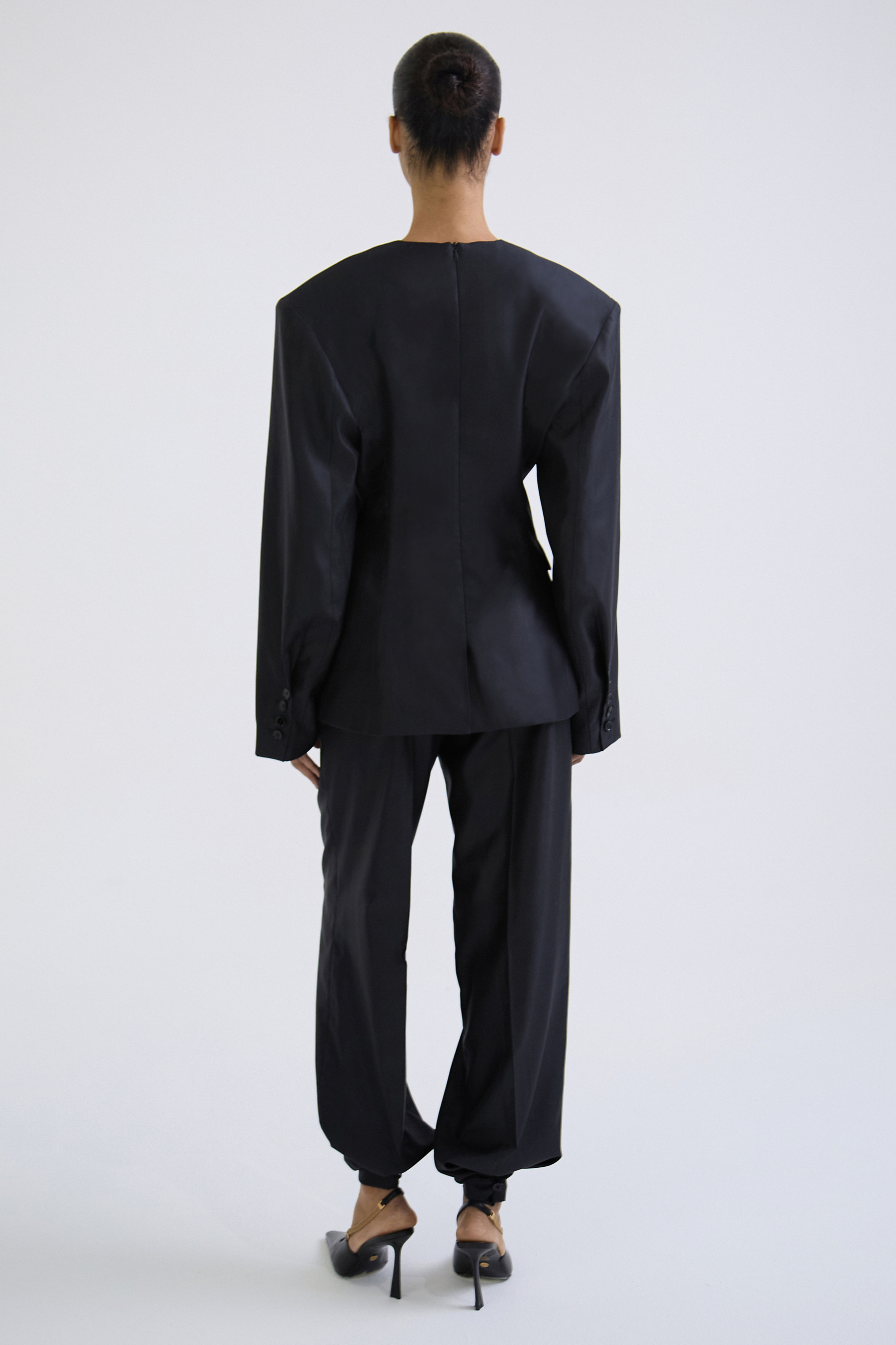Прямые брюки с выверенной посадкой и функциональной трансформацией силуэта. В классическом варианте модель выглядит строго и лаконично, а благодаря фиксации по низу — петле и пуговице — силуэт можно собрать по щиколотке, придавая образу более расслабленный, современный характер.