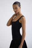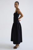 Прилегающий верх с вырезом каре подчёркивает линию плеч и ключиц. Отрезная юбка по линии бёдер со сборкой формирует объём и балансирует пропорции. Длина макси усиливает вертикаль и собирает образ в единую, выразительную линию.