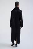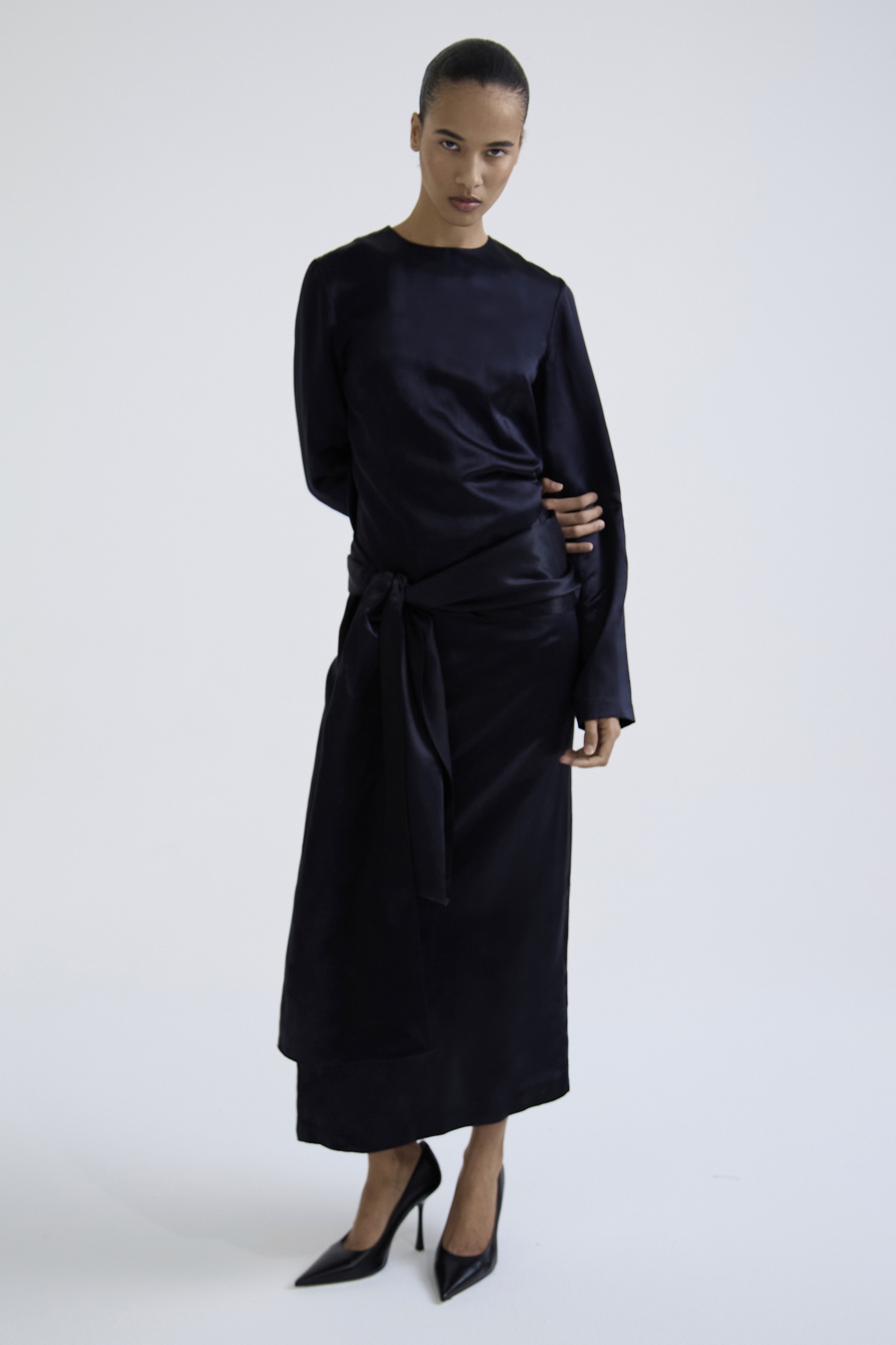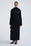 Платье Midnight выполнено из шелка и кашемира — материал мягко отражает свет, создавая благородный сатиновый блеск и глубокий цвет.