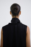 Высокая горловина драпируется мягкими складками, а швы по центру полочки и спинки задают вертикаль и собирают силуэт. Эластичная линия низа фиксирует форму на бёдрах, создавая мягкий объём и подчёркивая пропорции.