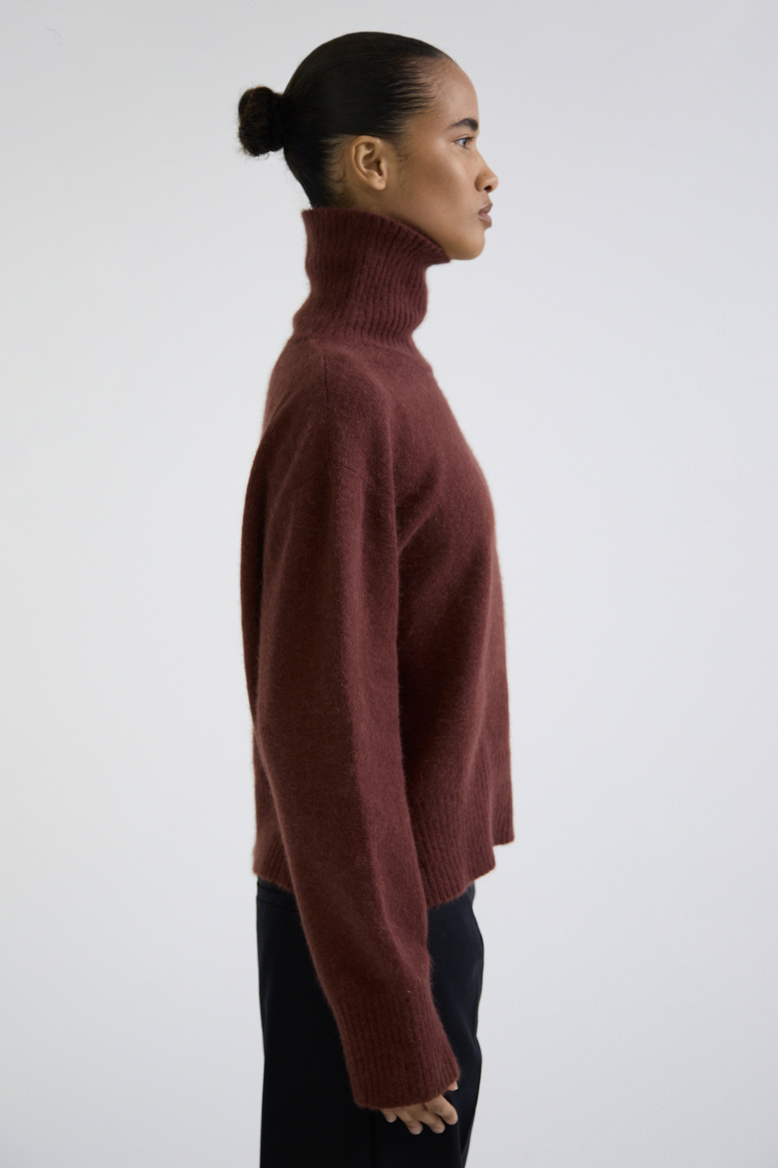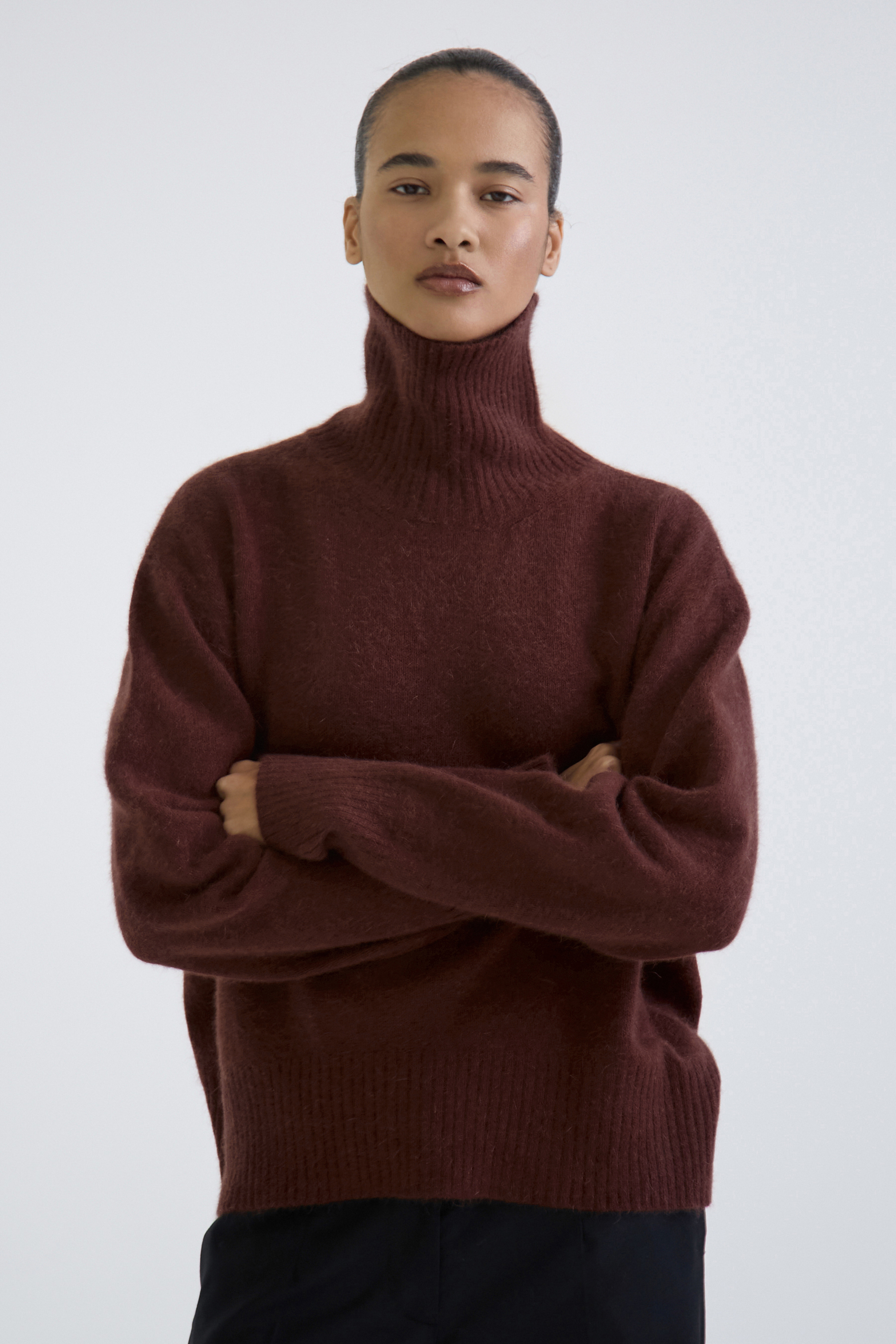 Свитер из пуха лисы с высоким горлом и удлинёнными рукавами.