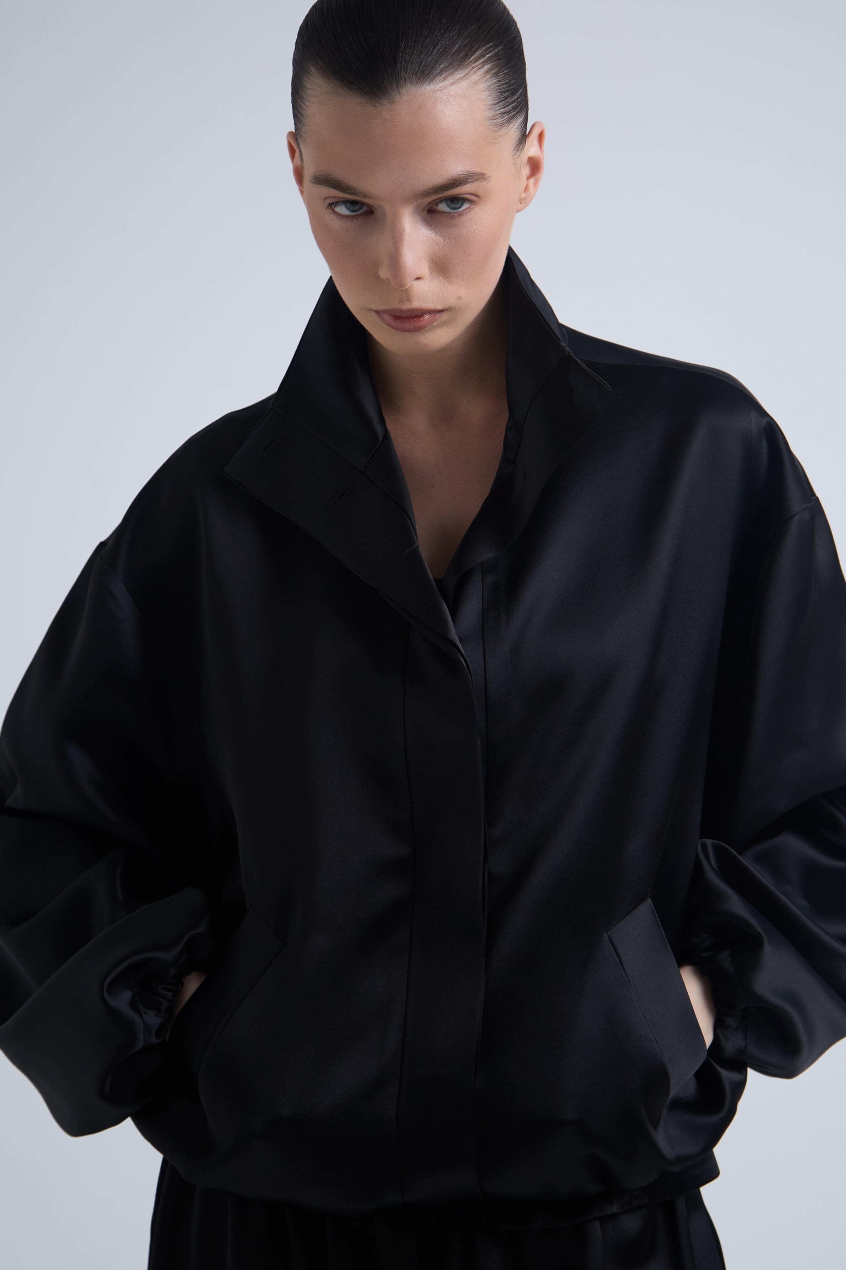 Бомбер Atlas выполнен из плотного ацетатного атласа с выраженным переливом и пластичной поверхностью. Тяжёлая текучая ткань формирует мягкий объём и подчёркивает архитектуру силуэта.