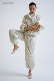 За счет мягкого пояса на резинке брюки сидят расслабленно, но при этом точно по фигуре. Силуэт свободный, с немного заниженной линией шагового шва — вдохновлён восточными формами, но переосмыслен в современном ключе. По низу брючин — скрытая кулиска, с помощью которой можно регулировать форму: носить расслабленно, в пол, или утягивать — для более графичного объёма.