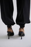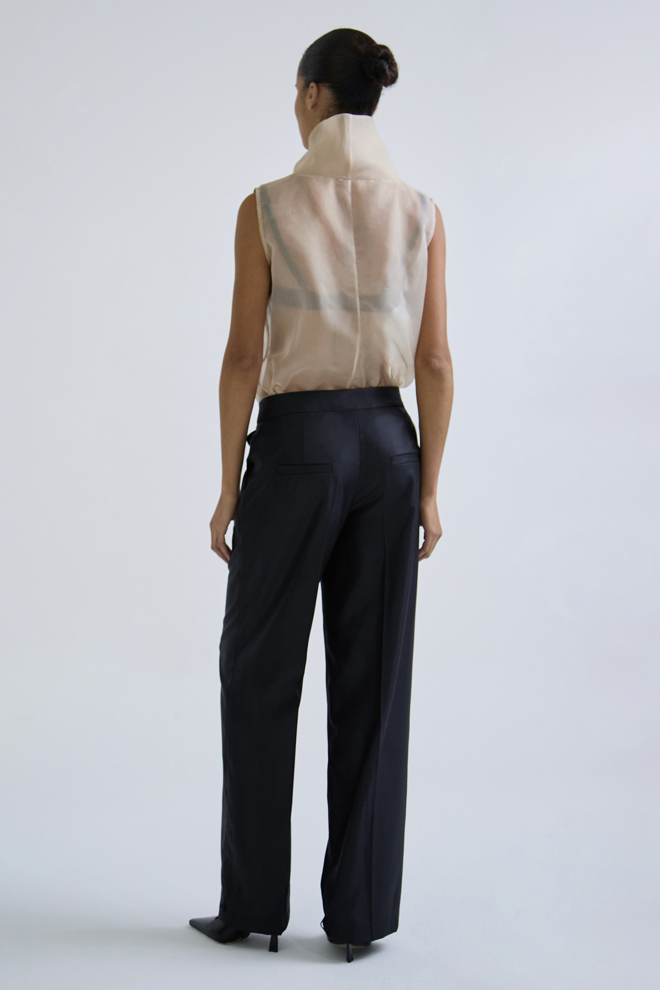 Прямые брюки с выверенной посадкой и функциональной трансформацией силуэта. В классическом варианте модель выглядит строго и лаконично, а благодаря фиксации по низу — петле и пуговице — силуэт можно собрать по щиколотке, придавая образу более расслабленный, современный характер.
