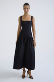 Прилегающий верх с вырезом каре подчёркивает линию плеч и ключиц. Отрезная юбка по линии бёдер со сборкой формирует объём и балансирует пропорции. Длина макси усиливает вертикаль и собирает образ в единую, выразительную линию.