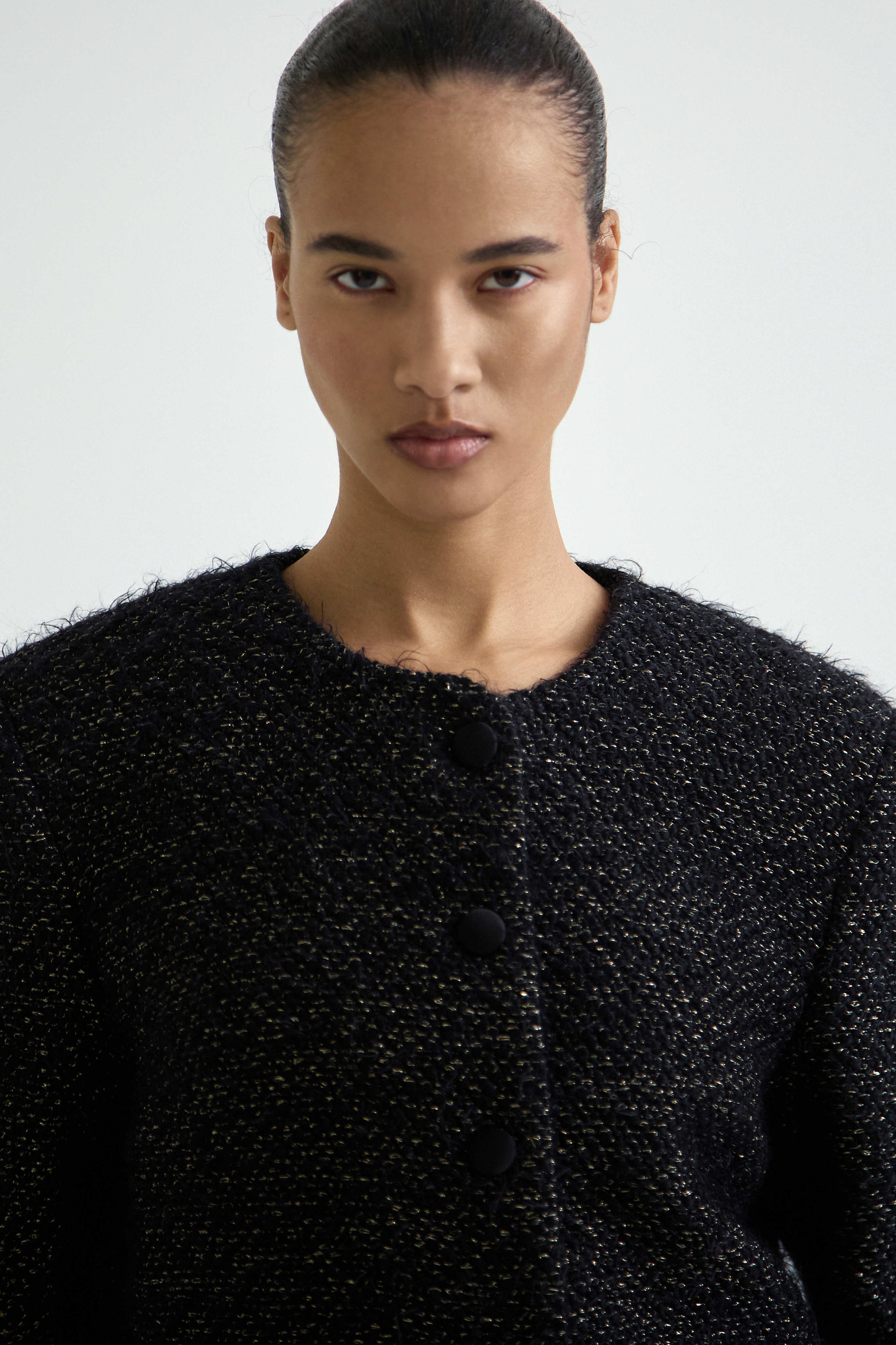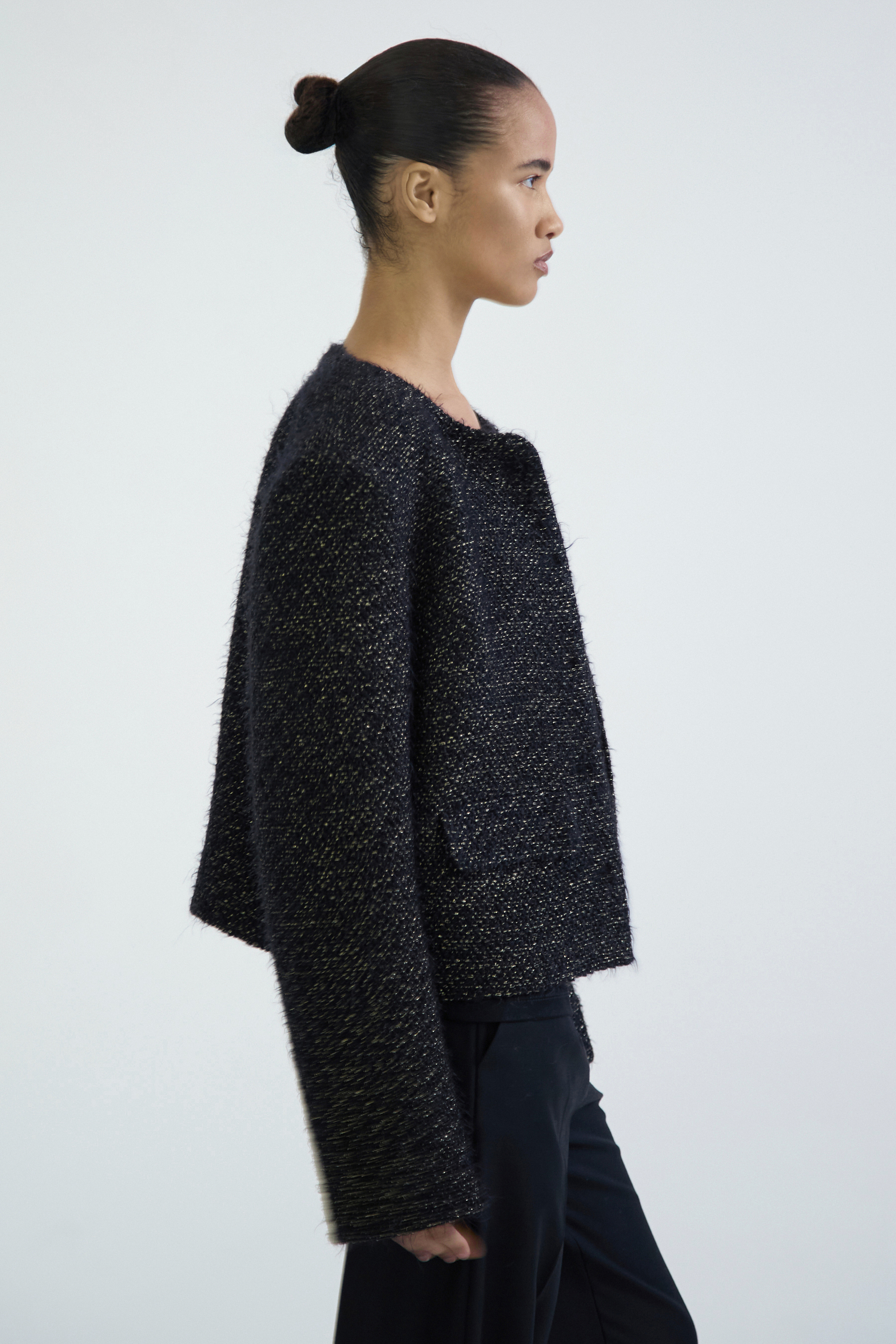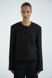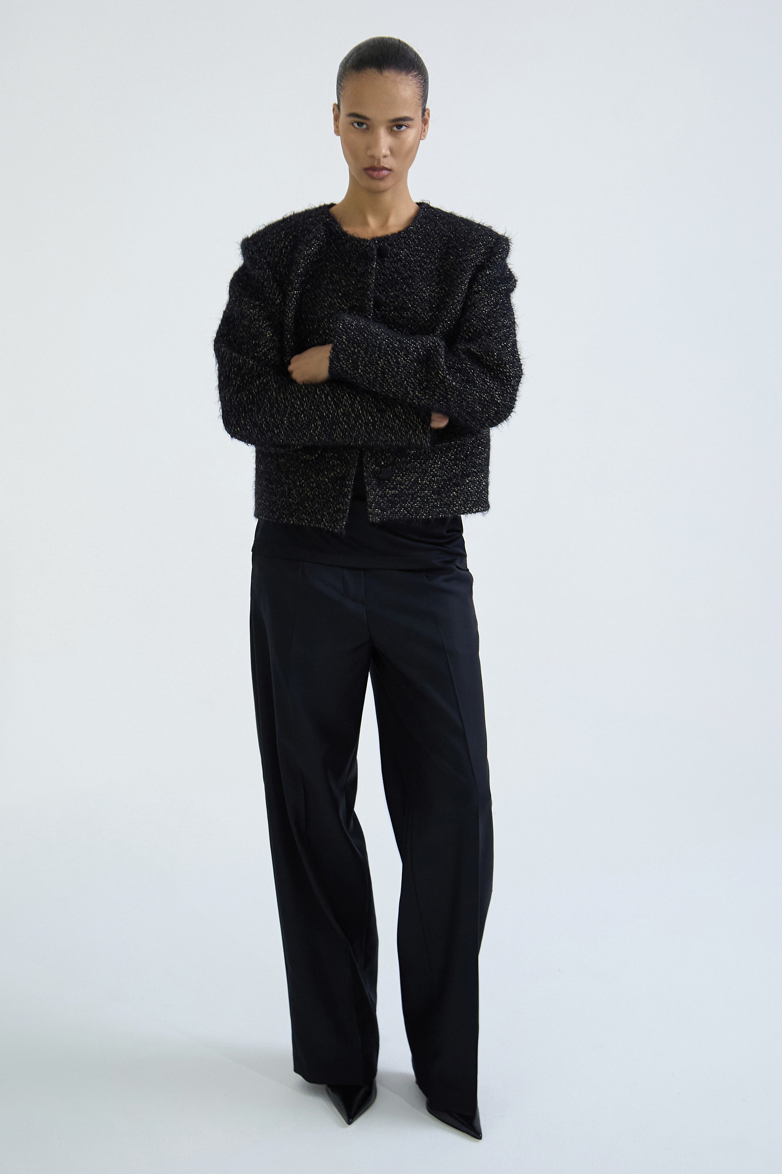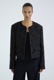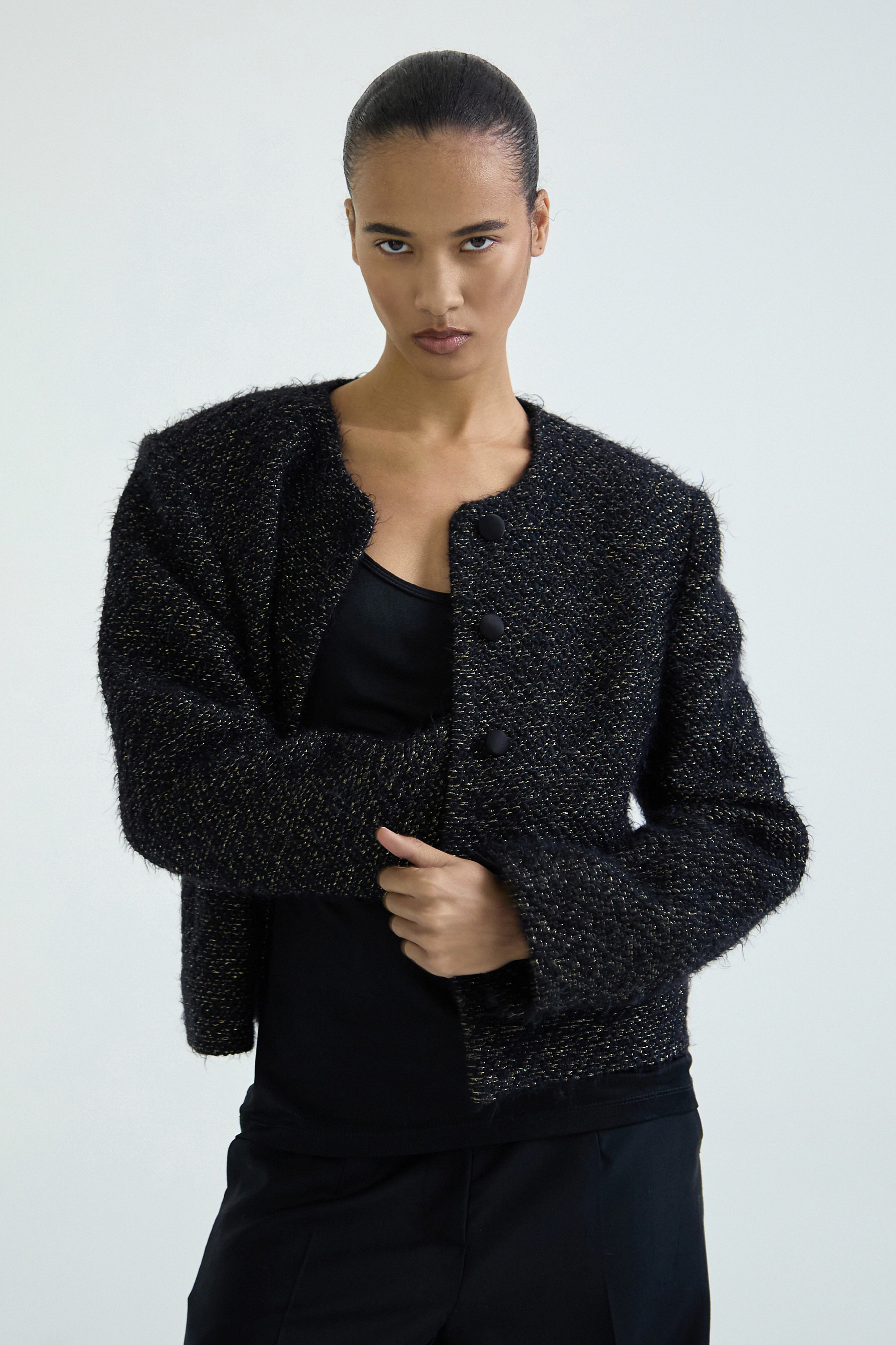 Укороченный твидовый жакет с увеличенной линией плеч и объёмным силуэтом.