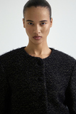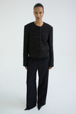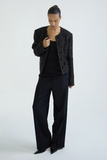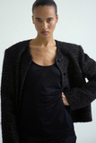 Жакет выполнен из итальянского твида на основе шерсти с добавлением люрекса и ангоры. Это не традиционный твид — он теплее, мягче и телеснее, с деликатным блеском и глубиной поверхности. Ткань отличается мягкой, слегка пушистой фактурой и выраженной плотностью.