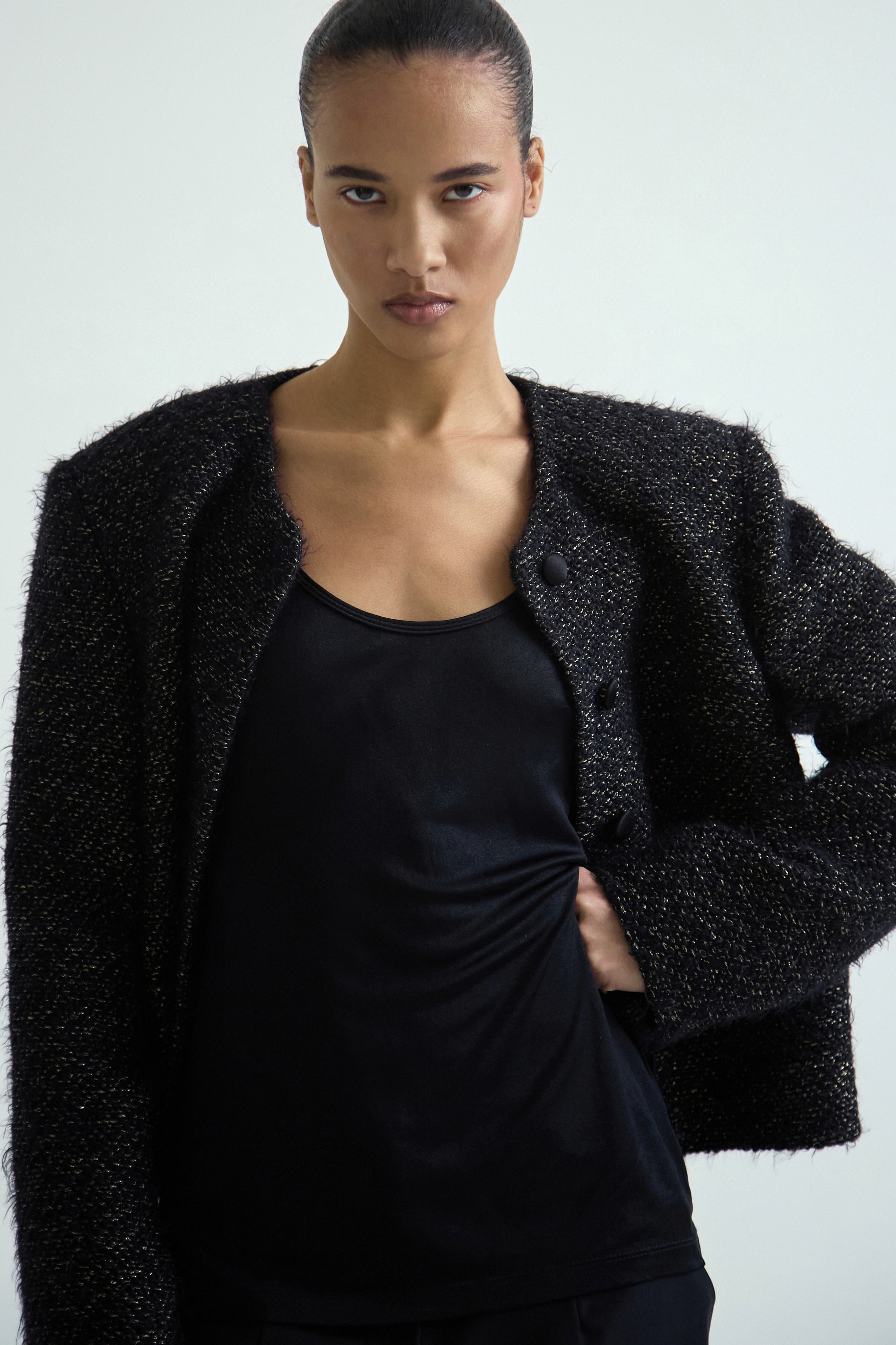 Жакет ощущается как вещь с характером и весом, в которой форма и материал работают на одно впечатление.