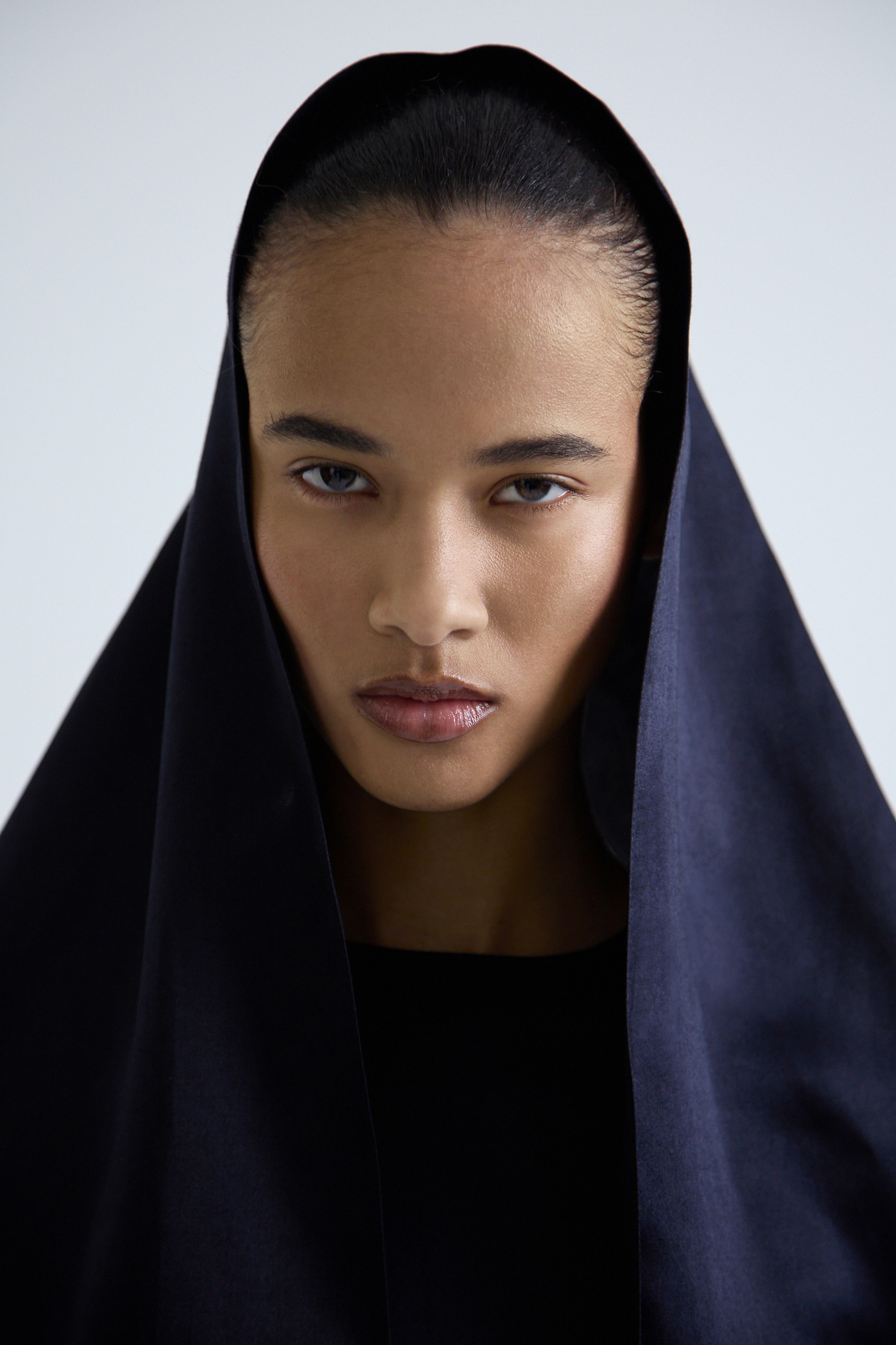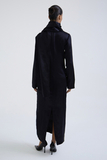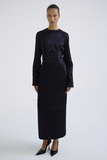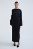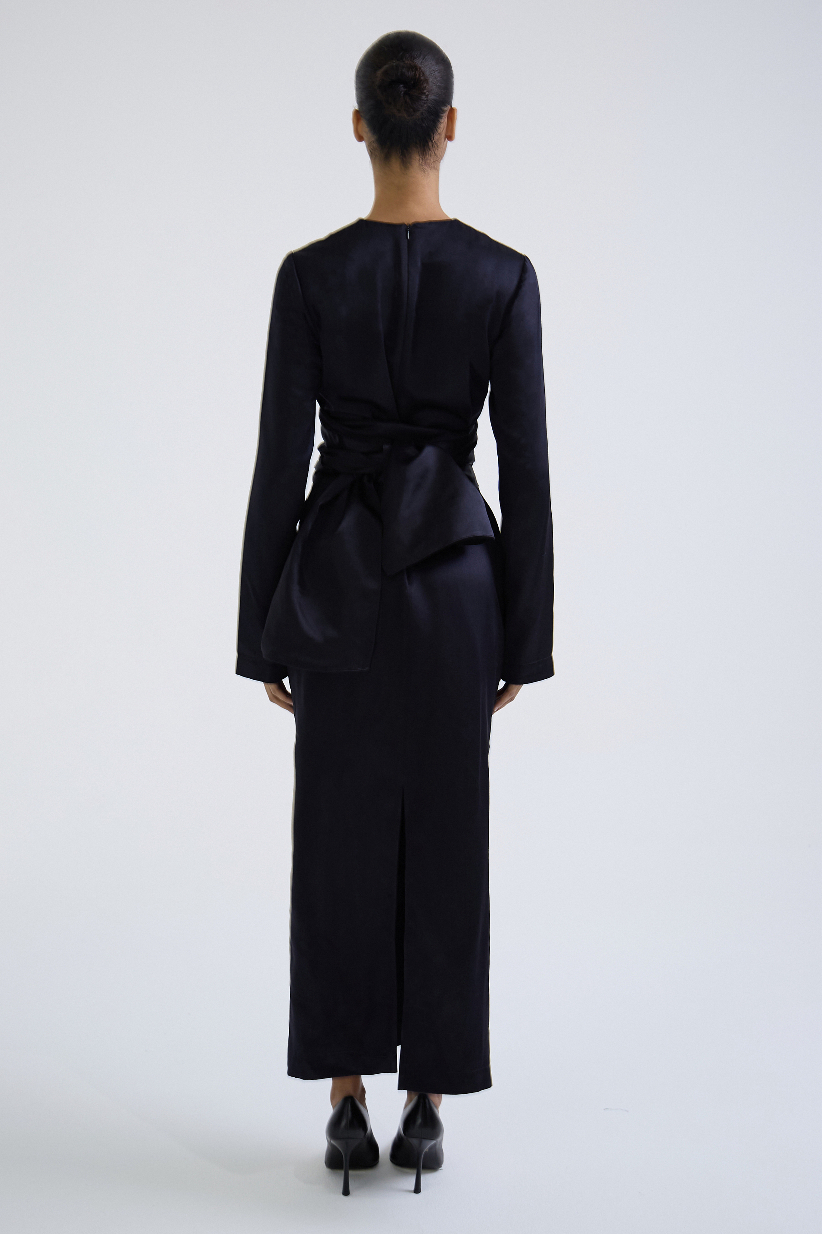 Платье Midnight выполнено из шелка и кашемира — материал мягко отражает свет, создавая благородный сатиновый блеск и глубокий цвет.